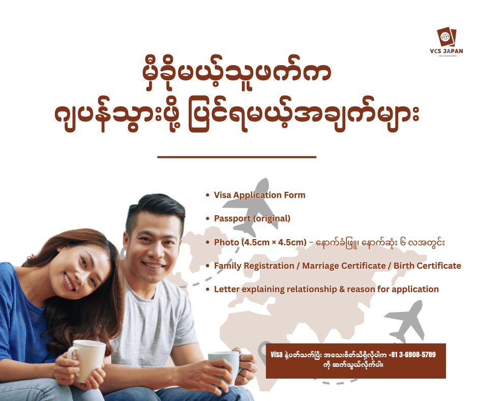 ကိုယ့်မိသားစု၊ကိုယ့်ချစ်သူကို ဂျပန်ခေါ်ဖို့အတွက် အချက်အလက်အသေးစိတ်နဲ့ပတ်သက်ပြီးတော့ သိရှိလိုပါက VCS Japan က အနားမှာ ရှိနေပါတယ်။