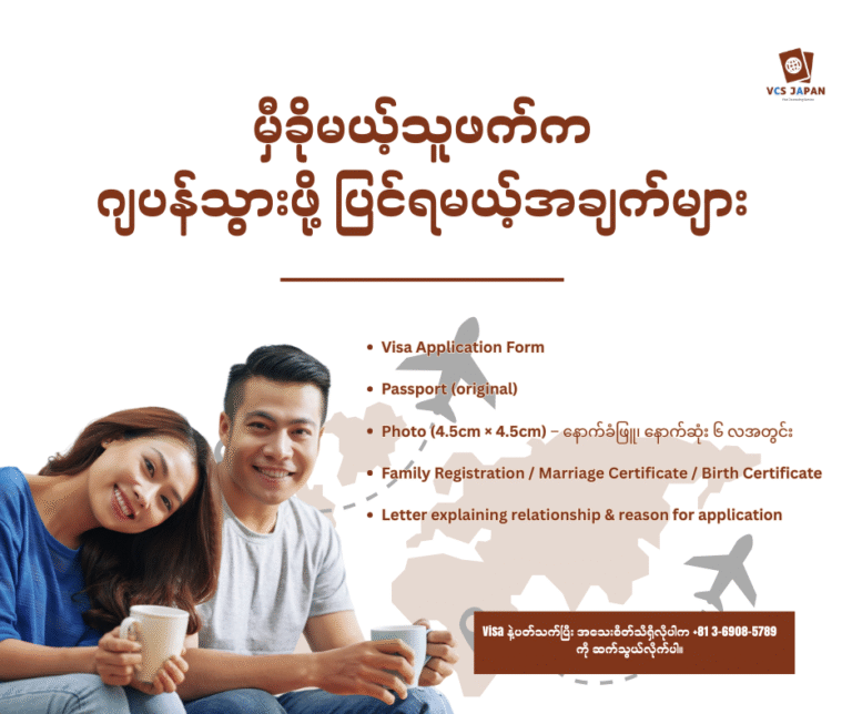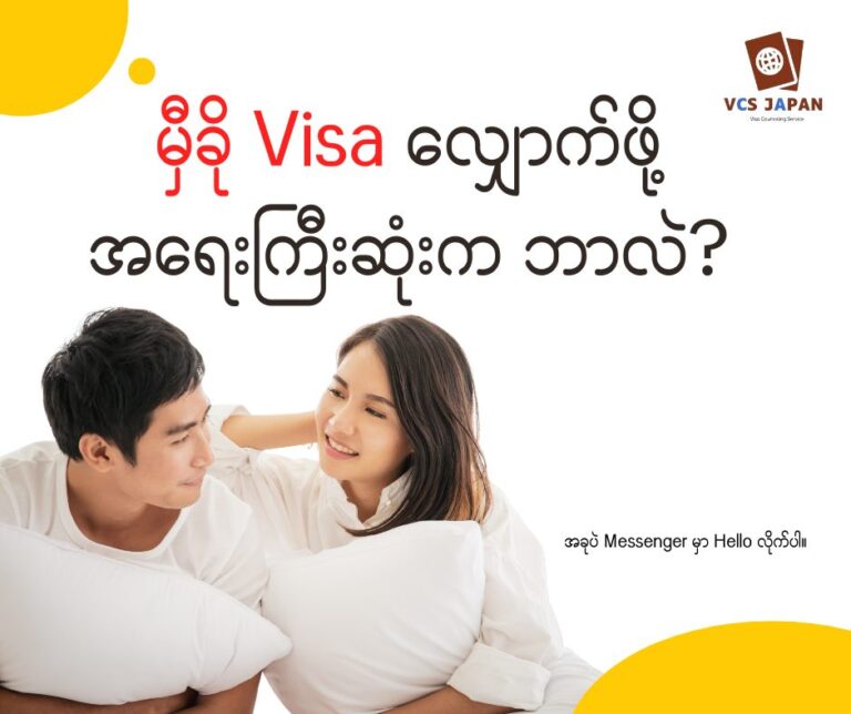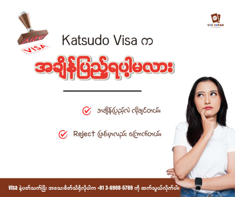 ဂျပန်သွားဖို့ပဲဖြစ်ဖြစ်၊ ဂျပန်မှာ Visa ပြောင်းဖို့ပဲဖြစ်ဖြစ်… စိတ်ပူနေရပြီလား? Visa Consulting ယူဖို့ မေ့နေကြမှာစိုးလို့ တစ်ချက်လောက် သတိပေးပါရစေ။ ဂျပန်ရောက်ဖို့ စိတ်ကူးရှိရင်ဖြစ်ဖြစ်၊ ရောက်နေပြီးသားသူတွေ ဗီဇာကိစ္စ အခက်အခဲရှိရင်ဖြစ်ဖြစ် VCS Japan ရှိတယ်နော်။ အဓိက အားသာချက်ကတော့ ဂျပန်နိုင်ငံက ရှေ့နေကိုယ်တိုင် သေချာတိုင်ပင်ဆွေးနွေးပေးမှာဖြစ်လို့ အချက်အလက်မှန်ကန်မှုအတွက် ၁၀၀% စိတ်ချရပါတယ်။ လျင်မြန် လွယ်ကူစွာ လုပ်ချင်သူများ အချက်အလက် တိတိကျကျနဲ့ ပြင်ဆင်ချင်သူများ Reject မဖြစ်အောင် စနစ်တကျ လျှောက်ထားချင်သူများ အခုပဲ VCS Japan မှာ လုပ်ငန်းအပ်ပြီး […]